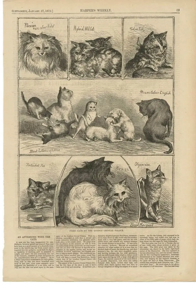 Das zweite Konzert der Katze fand im Dezember 1871 im Crystal Palace statt, und am 27. Januar 1872 veröffentlichte die Harpers Weekly den folgenden Artikel, der das Programm im Detail beschreibt. Diese Ausstellung wurde von persischen, wilden Hybridkatzen, Gabdiya -Katzen, der englischen Maus (Sekunde) vertreten Harrisonweir.com Dies ist eine britische Appo und Absina.